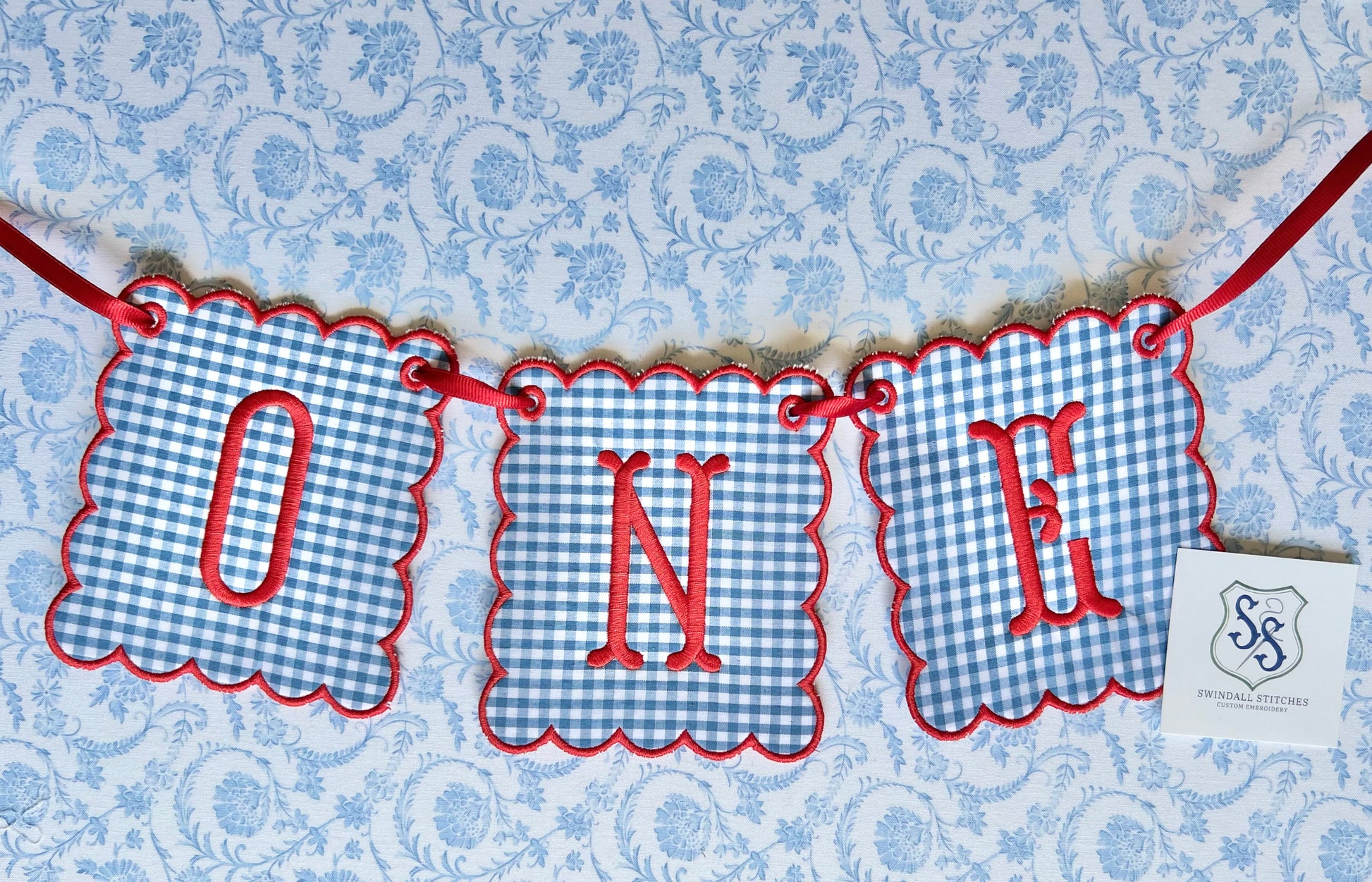 The fabric is a beautiful baby blue gingham banner with red embroidery. Ribbon color will be coordinated to match embroidery thread.