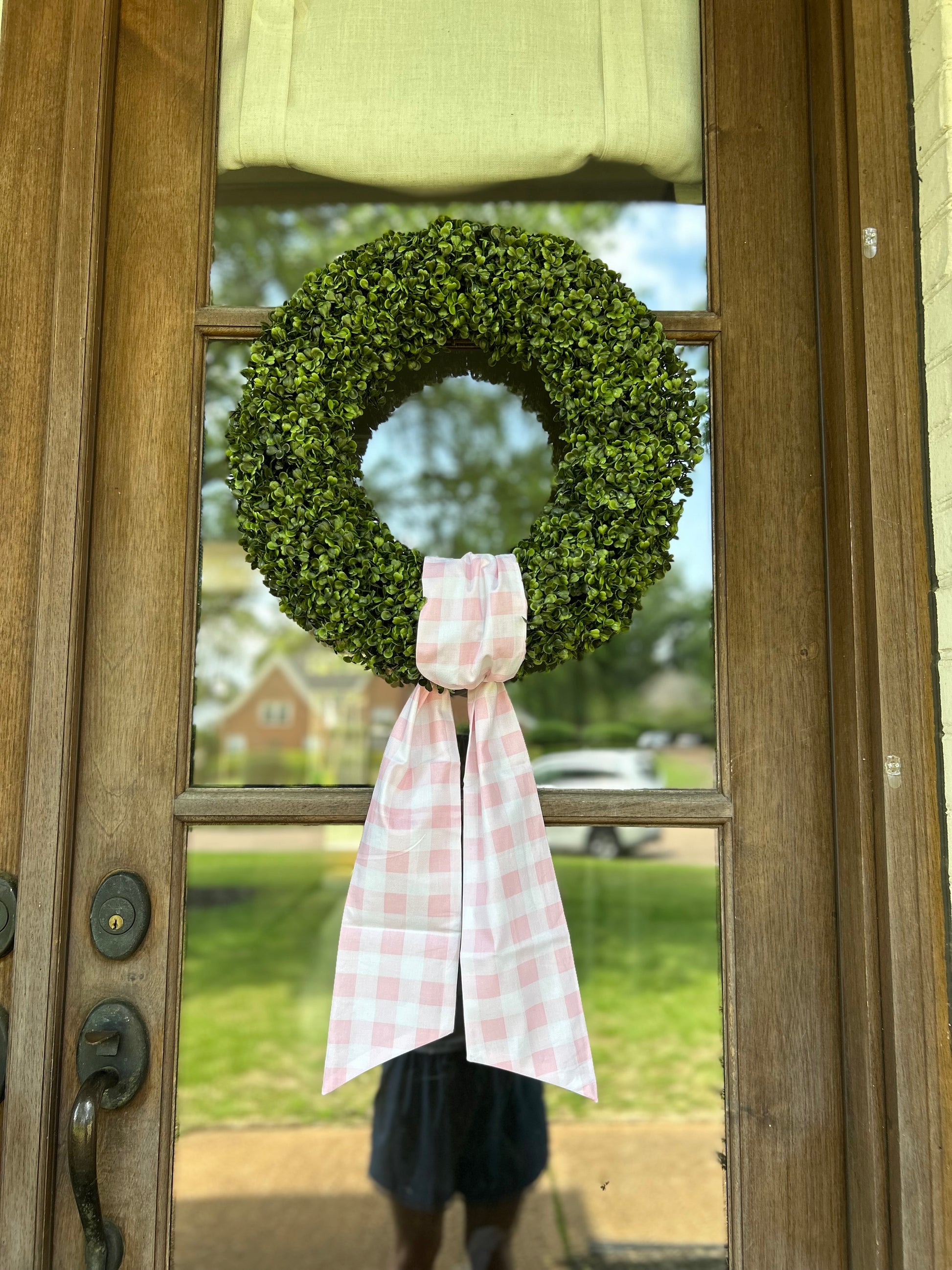 Gorgeous classic green toile wreath sash with a single letter monogram. Perfect refresh for your front door for spring and summer!